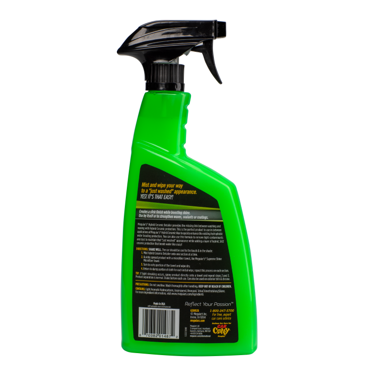 | El detallador de cerámica híbrida de Meguiar’s proporciona el eslabón perdido entre el lavado y encerado de cerámica híbrida. Este es el producto perfecto para usar entre las aplicaciones de nuestra cera híbrida de cerámica o la cera líquida híbrida de cerámica para mejorar rápidamente la protección hidrofóbica existente. ¡También puede usar esta fórmula avanzada para eliminar contaminantes ligeros y polvo para mantener esa apariencia de “recién lavado” mientras agrega una capa de protección híbrida de cerámica Si02 que repele el agua de una forma increíble! |