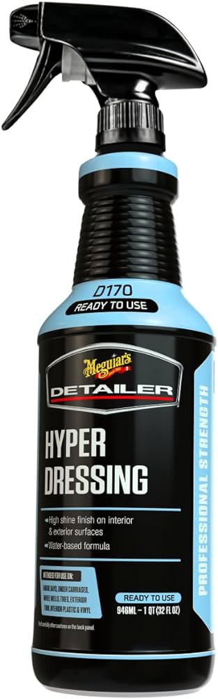 | iper Dressing de Meguiar´s: Es un producto acondicionador de cauchos y plasticos negros diluible hasta cuatro a uno, que permite variar el brillo de la terminación de alto a satinadosegún las necesidades de cada persona. Es un solo producto con una variedad de usos.. una combinación ganadora para todos los profesionales y la primera de la industria |