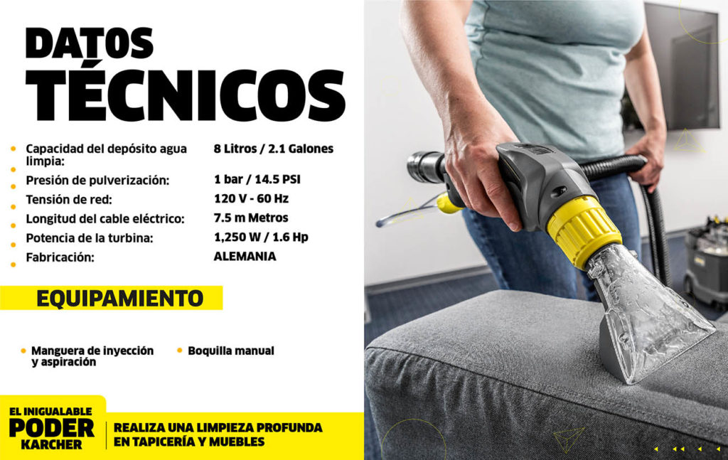 Un potente y compacto equipo de pulverización y aspiración combinadas para la limpieza de superficies enmoquetadas de pequeño tamaño. Ofrece el mejor resultado de reaspiración de todos los equipos comparables de la competencia. La Puzzi 8/1 C permite la rápida reutilización de las superficies textiles. El cable de alimentación puede colocarse en el gancho para cables desplegable. Soporte de boquillas para suelos integrado en el equipo.